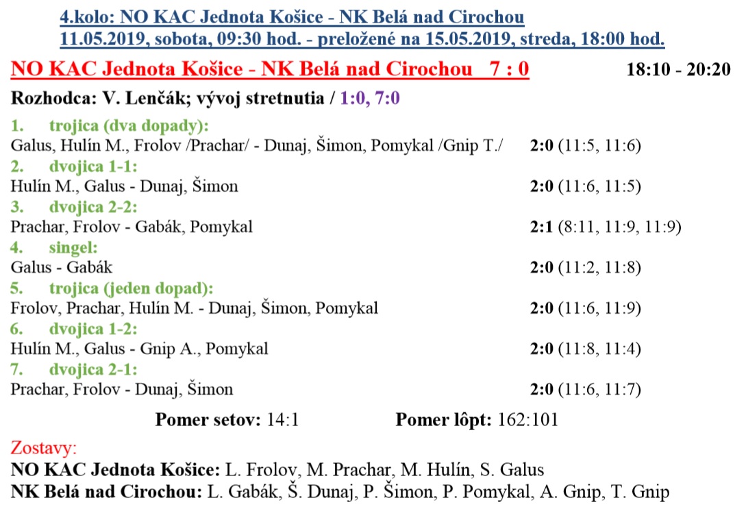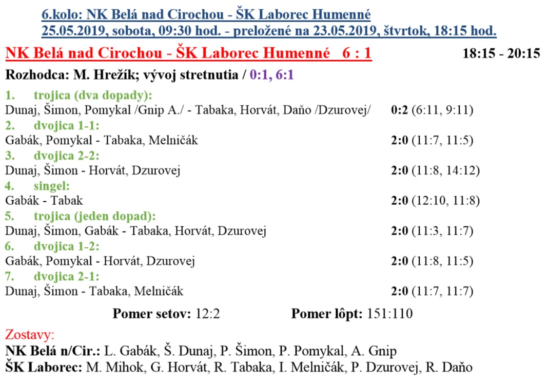 V 5. kole sme mali voľno a tak sme sa mohli pripraviť na prvé odvetné stretnutie proti Humennému, ktoré sme po vynikajúcom výkone zdolali pomerom 6:1! Napriek prehre v prvej trojke, sme dokázali zvyšných 6 zápasov vyhrať a výrazne sa tak priblížiť k tohtoročnému cieľu v základnej časti, ktorým je umiestnenie na 2. mieste tabuľky!